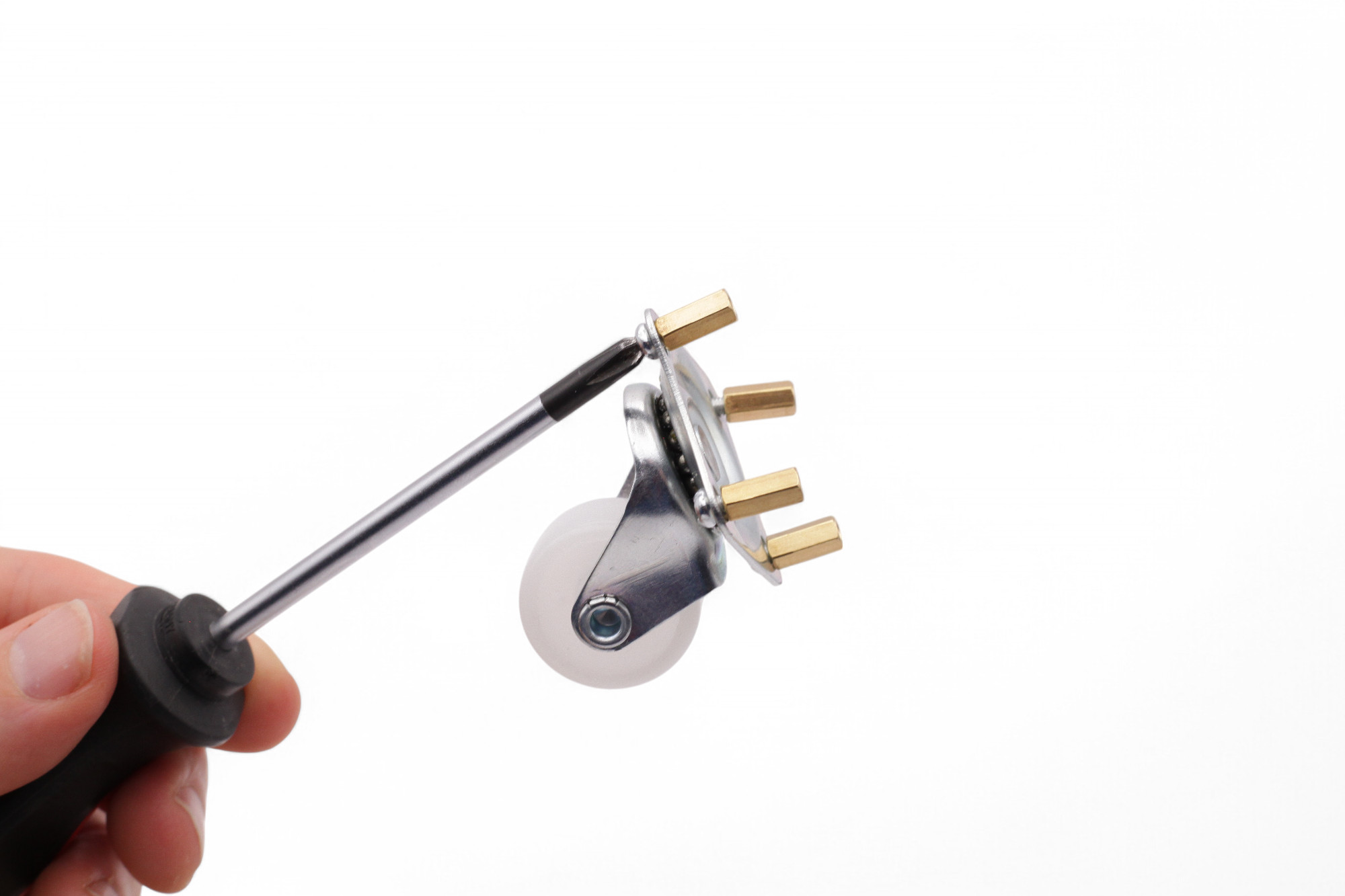 Schraube nun die Muttern auf die Schrauben und ziehe sie mit einem Schraubendreher fest: