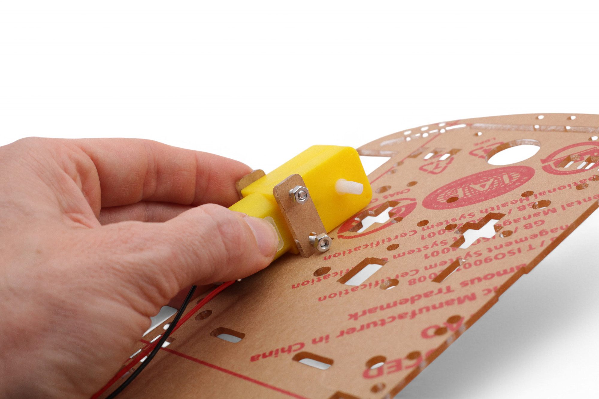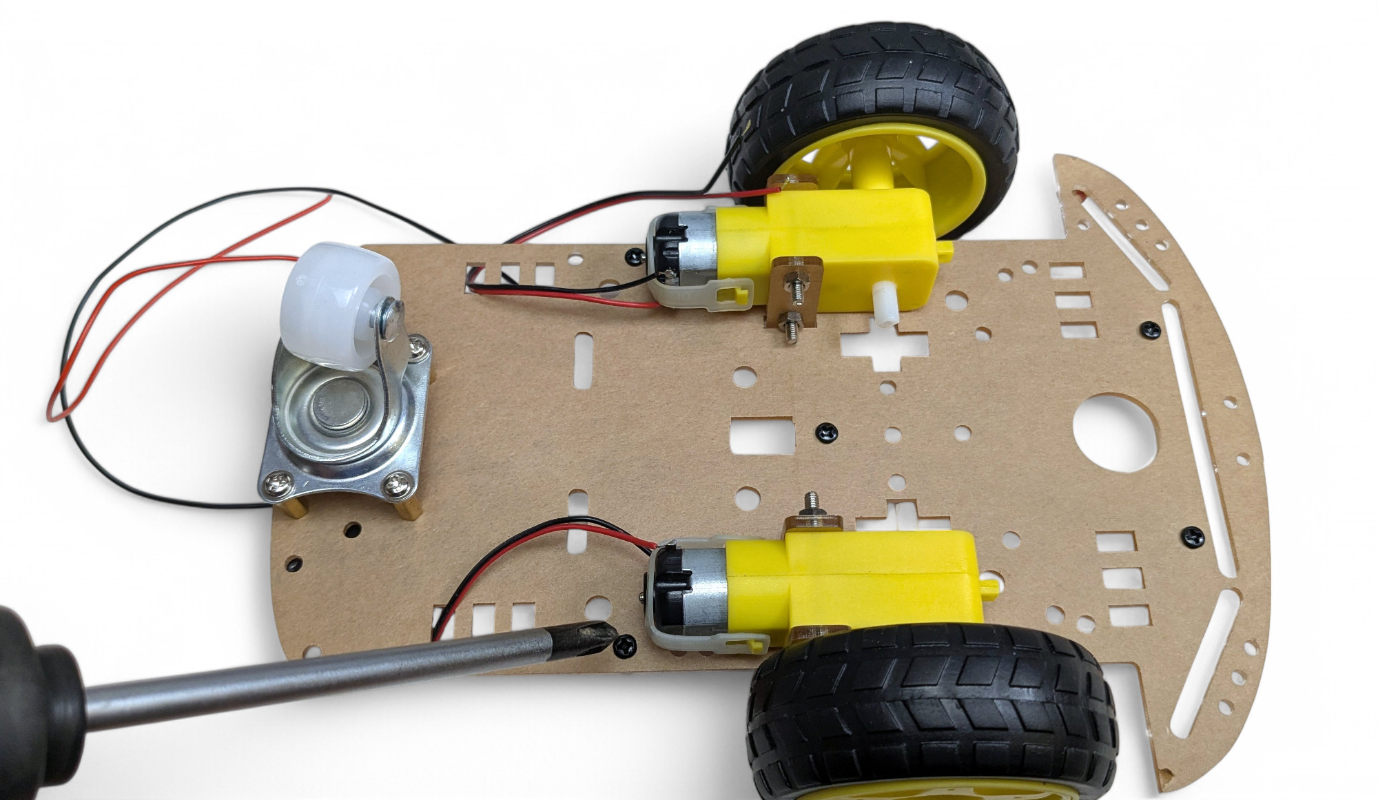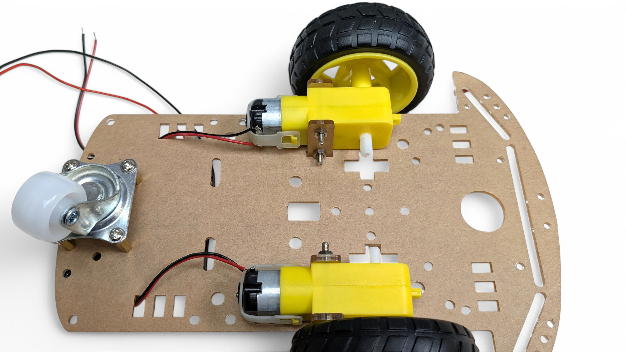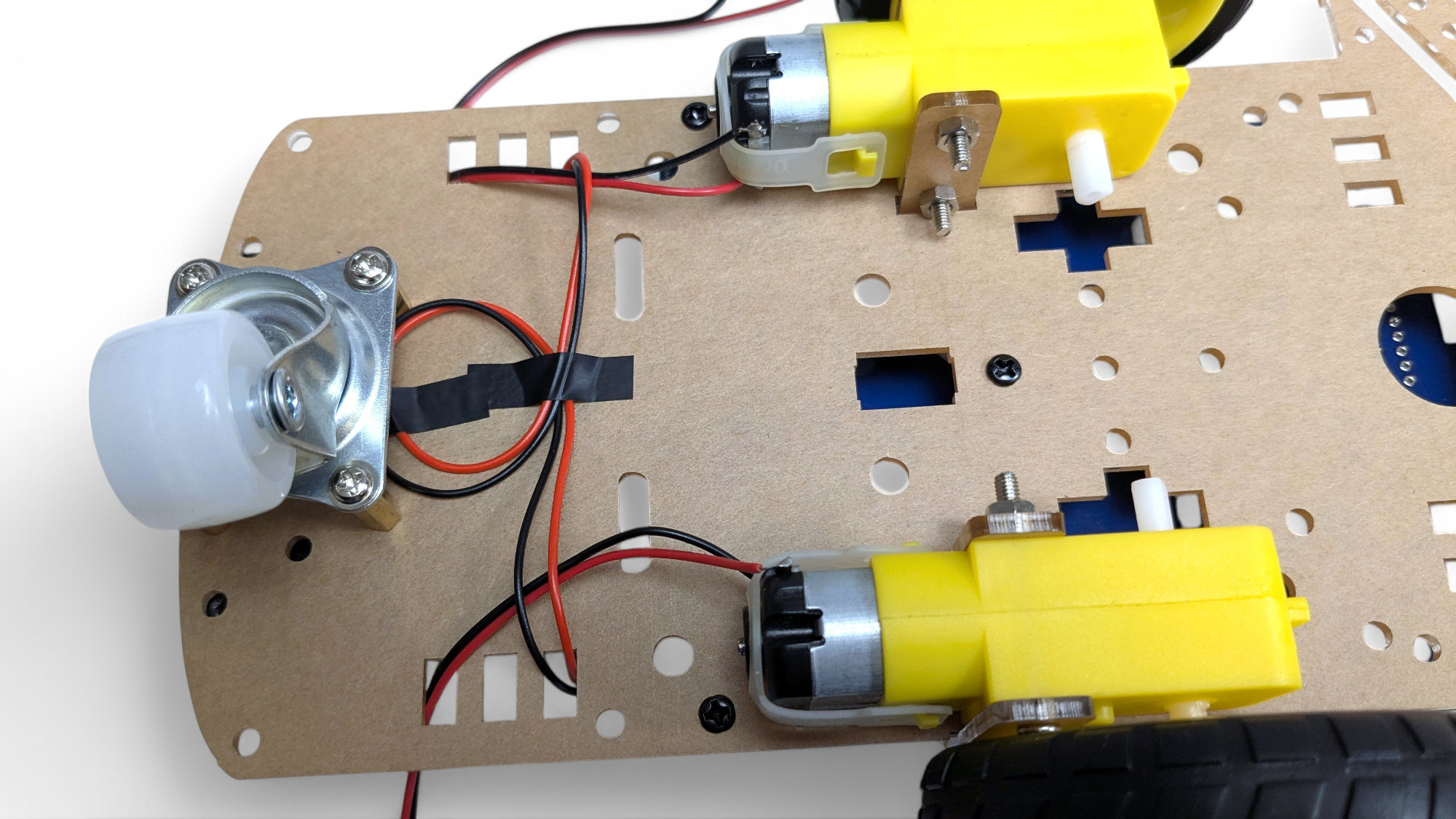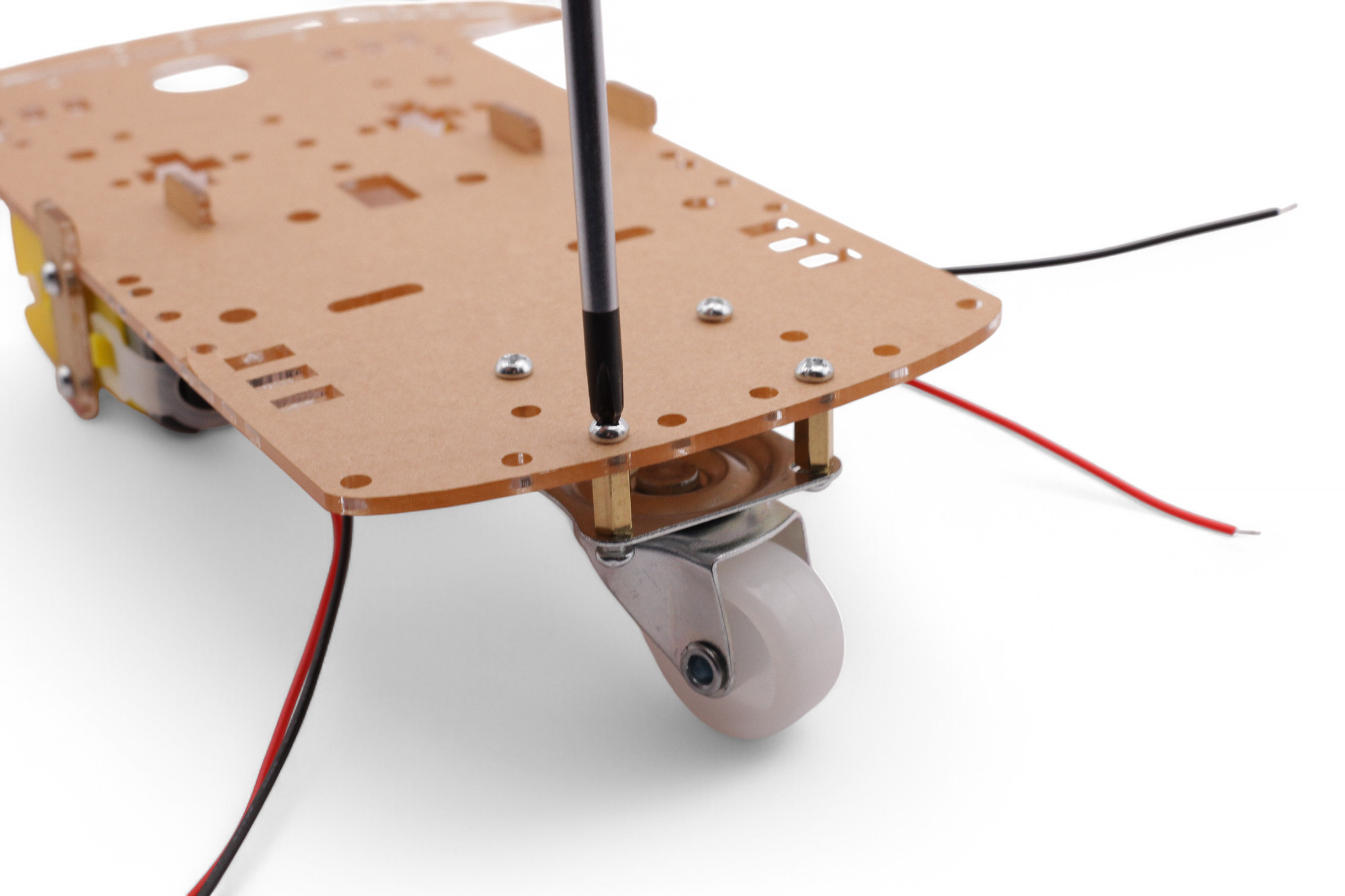 Jetzt bauen wir den Roboter fertig zusammen. Drehe den Bot um und fädle die Motor-Kabel auf die Oberseite: