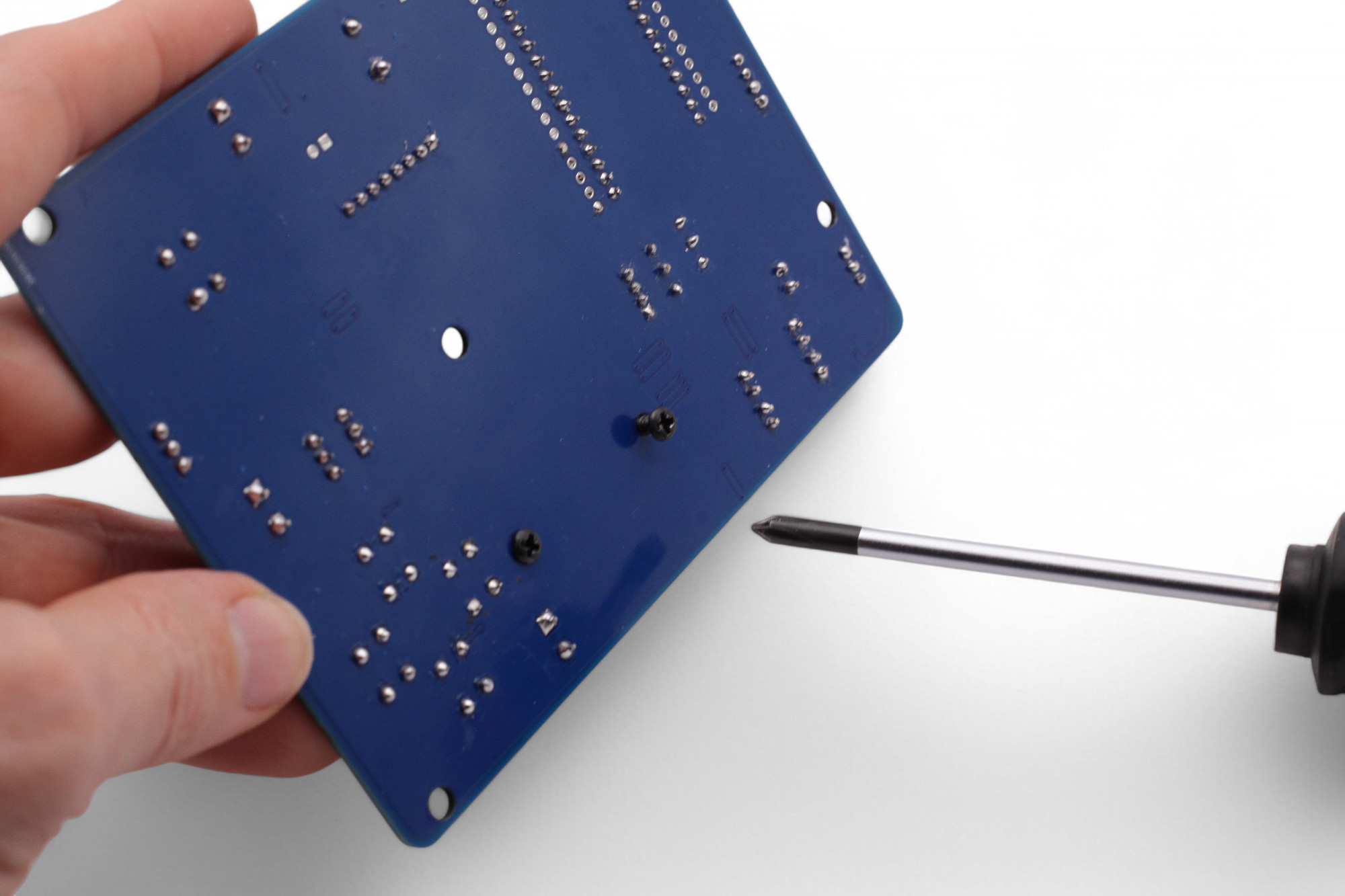 Befestige nun die Platine auf die Grundplatte. Zuerst die Schraube in der Mitte, dann an den vier Ecken. Schraube wieder zuerst die 5 Schrauben nur locker ein, dann ziehe sie alle fest: