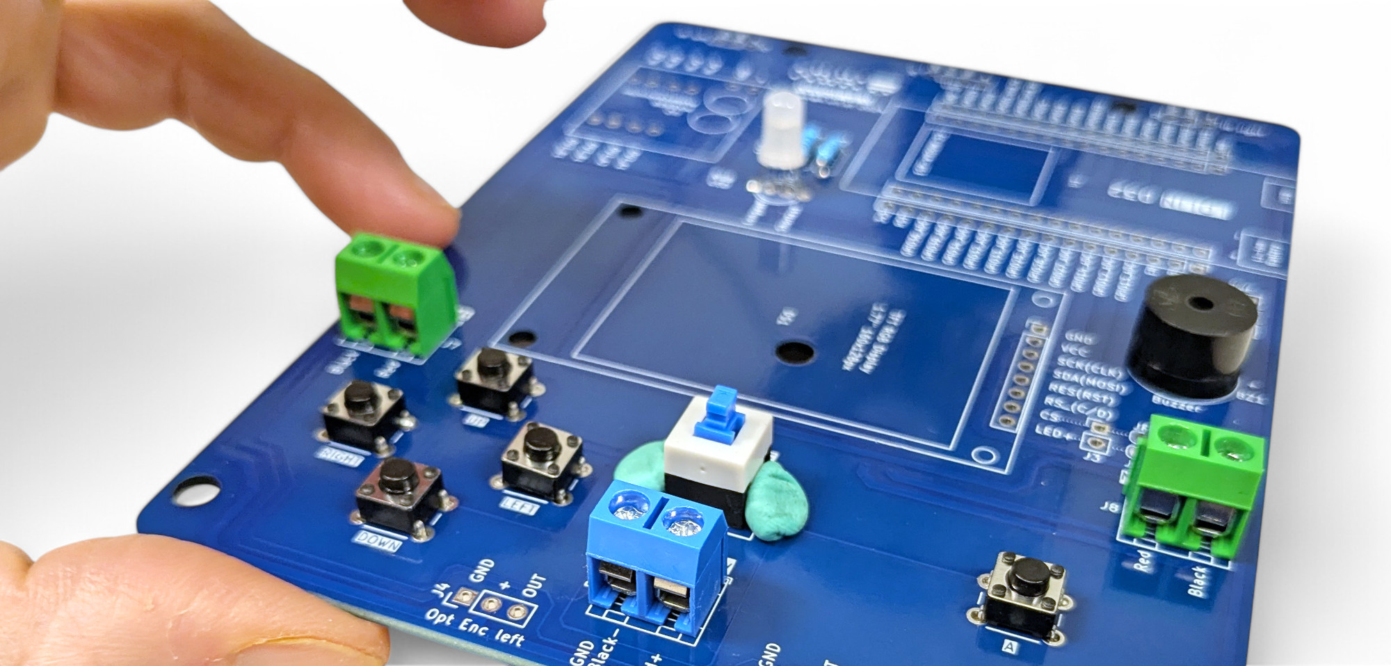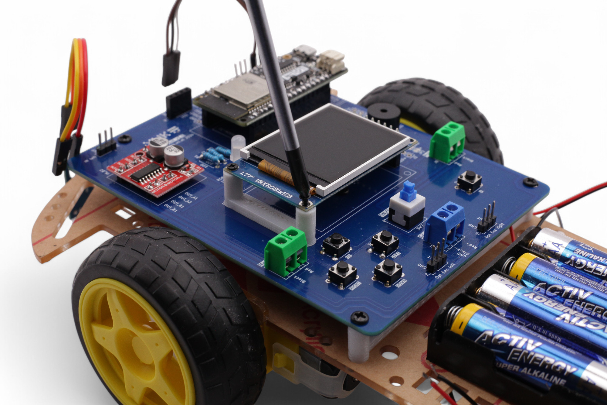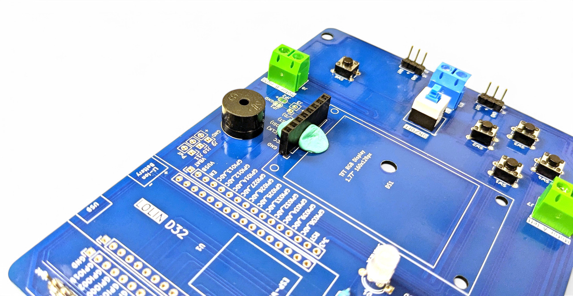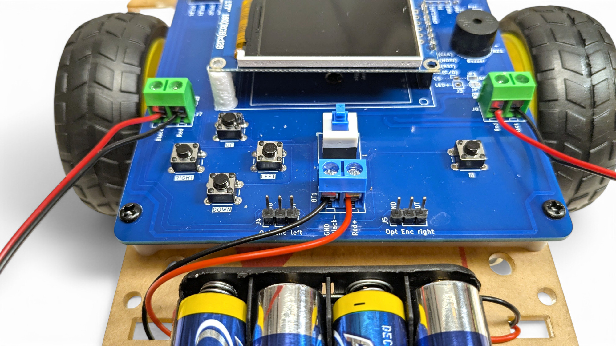 Wir verwenden eine blaue Anschlussklemme in der Mitte für den Batteriehalter, und zwei grüne links und rechts für die Motoren.