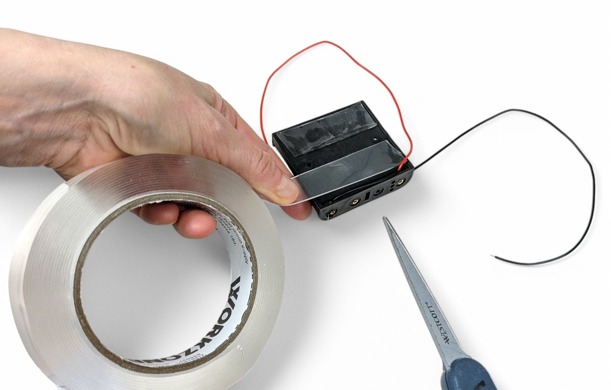Schneide zwei Streifen von dickem, doppelseitigen Klebeband ab und klebe es auf die Unterseite des Batteriehalters: