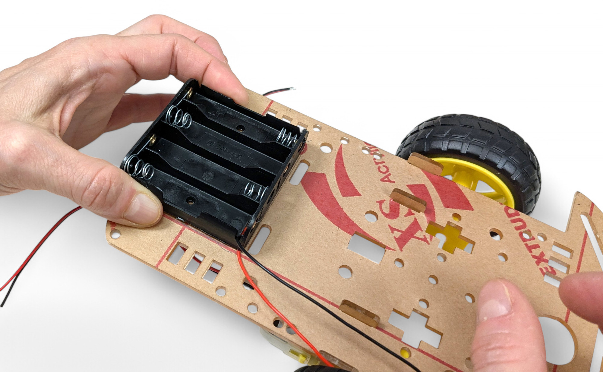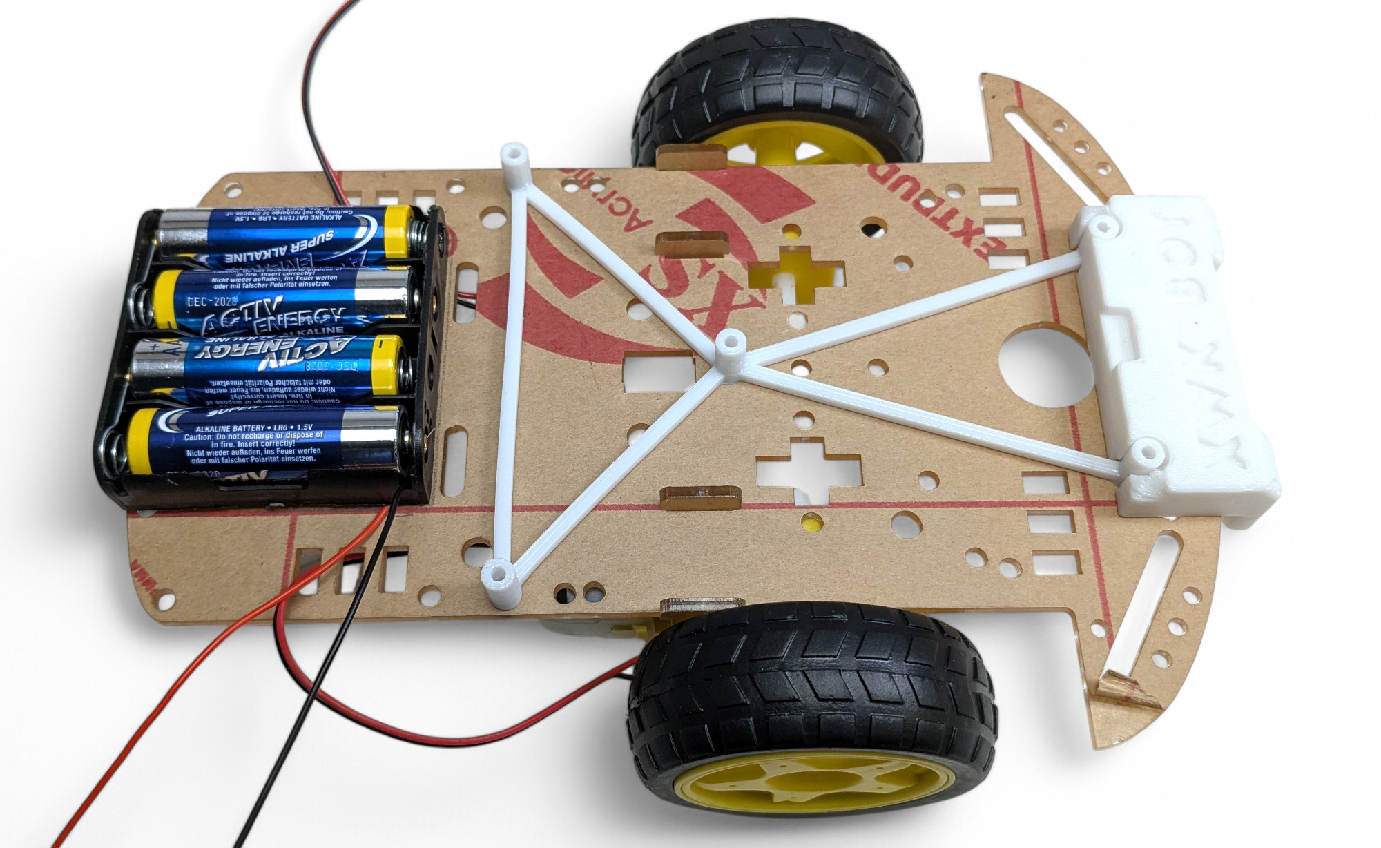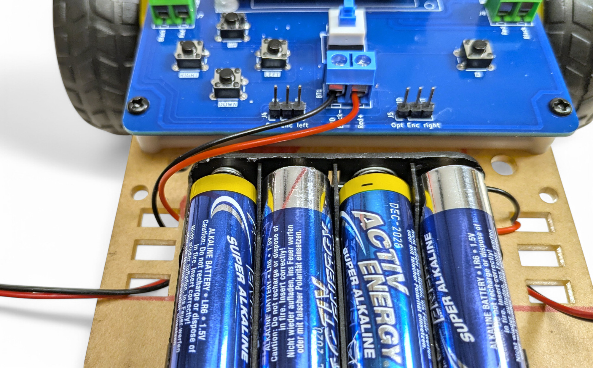 Achtung unbedingt auf die Polarität! Rot/Red = “+ (Pluspol) und Schwarz/Black =”- (Minuspol)! Wenn du das vertauscht kannst du den Roboter zerstören!