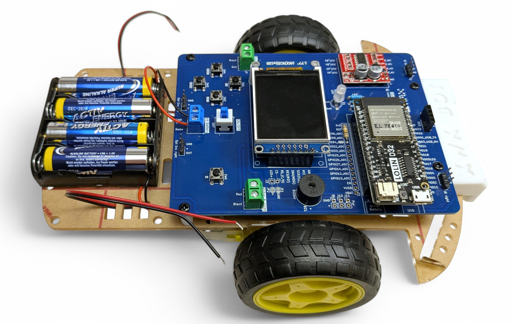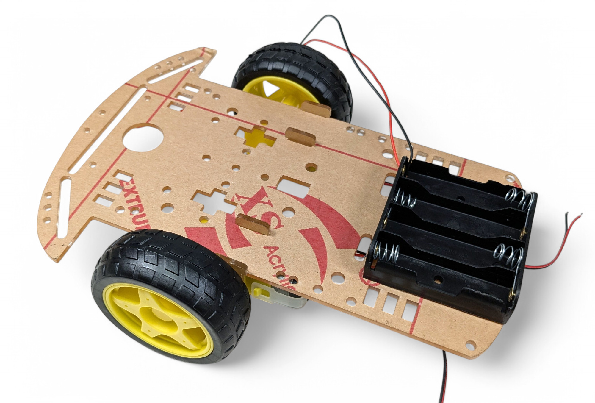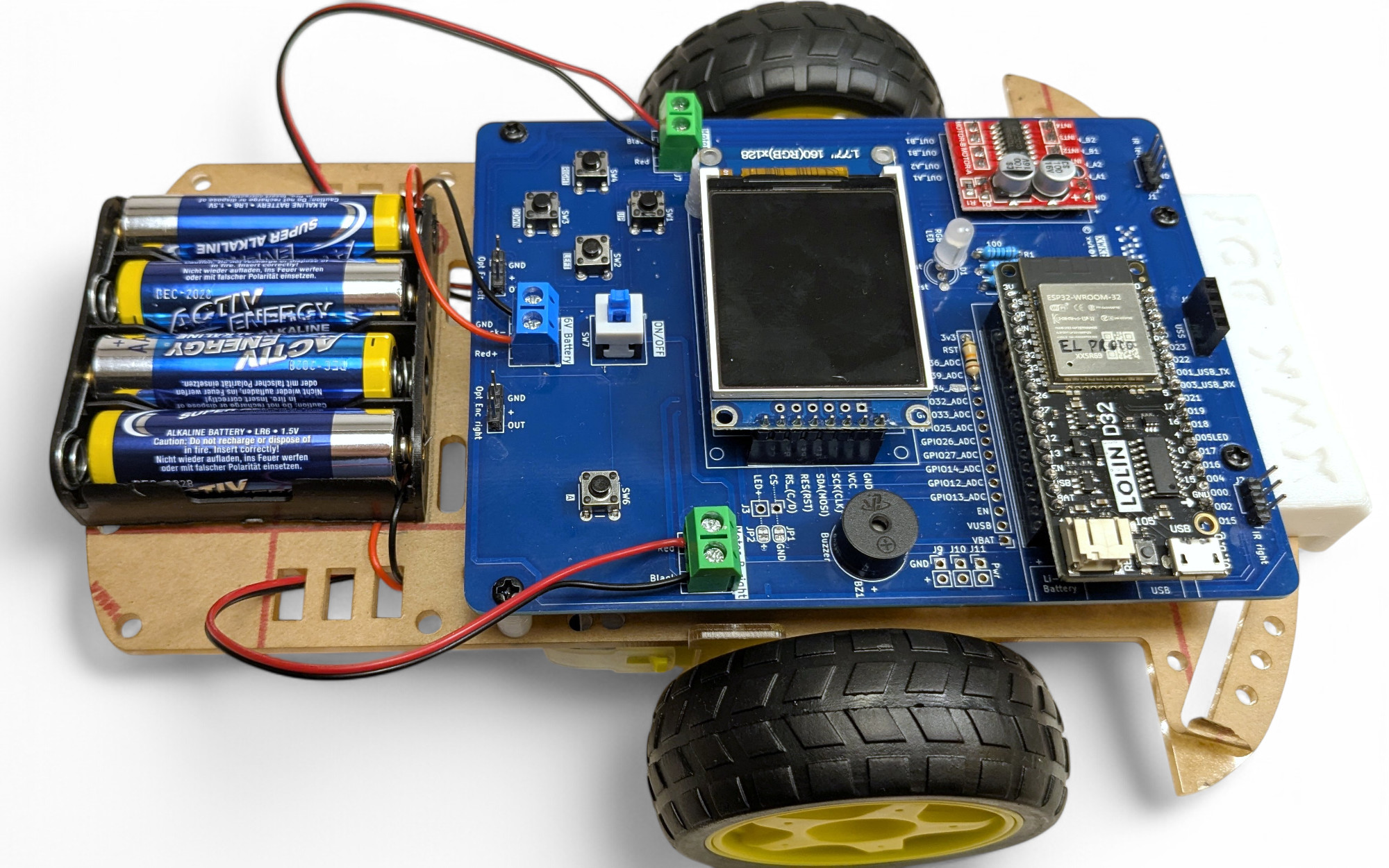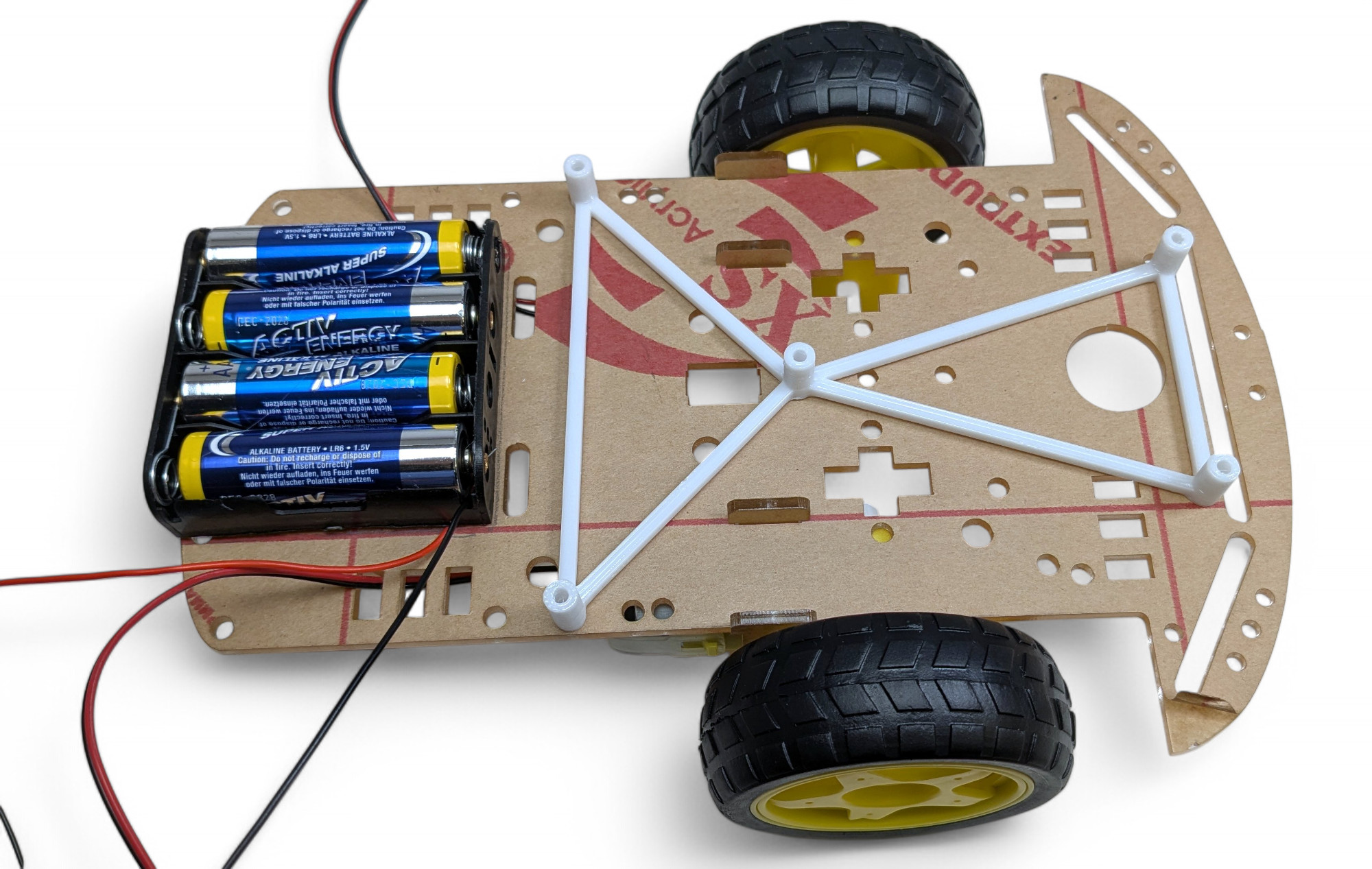 Achtung unbedingt auf die Polarität! Rot/Red = “+ (Pluspol) und Schwarz/Black =”- (Minuspol)! Wenn du das vertauscht kannst du den Roboter zerstören!