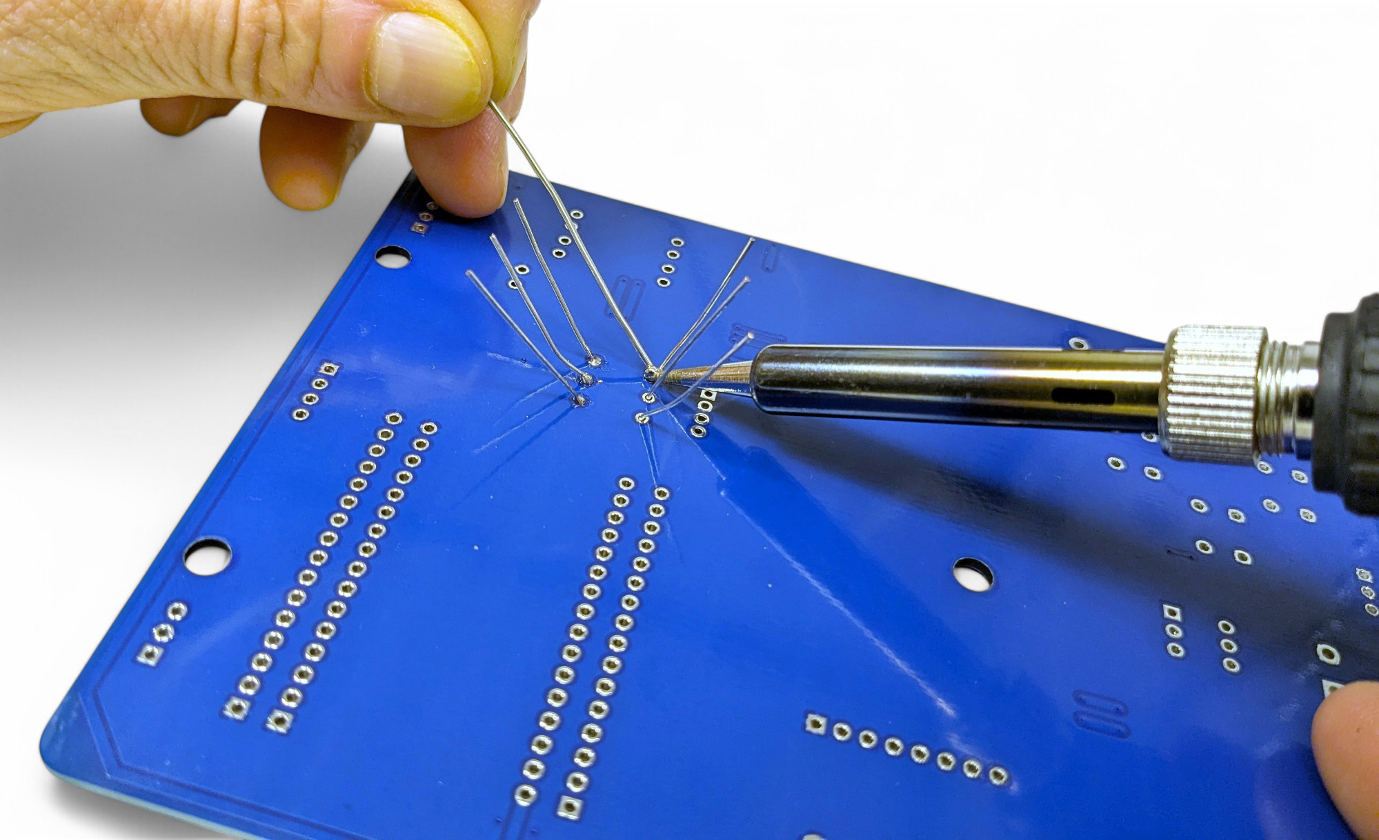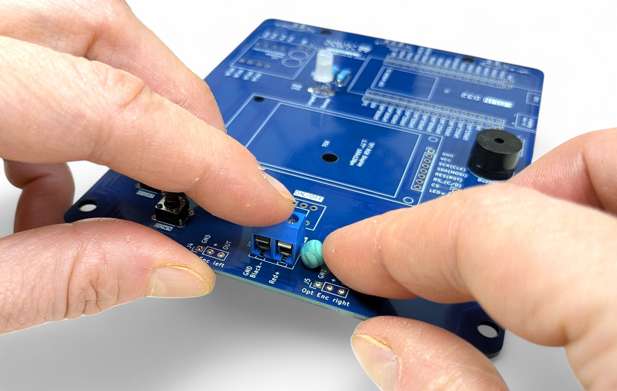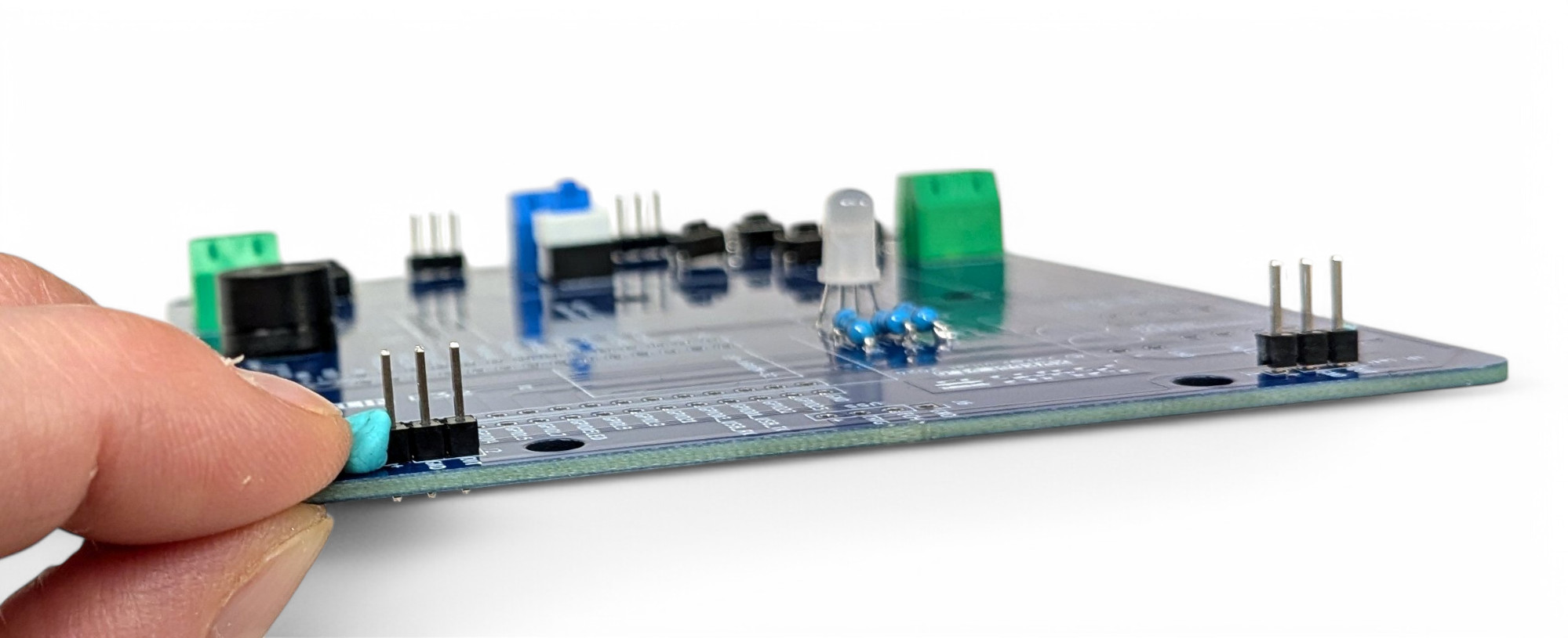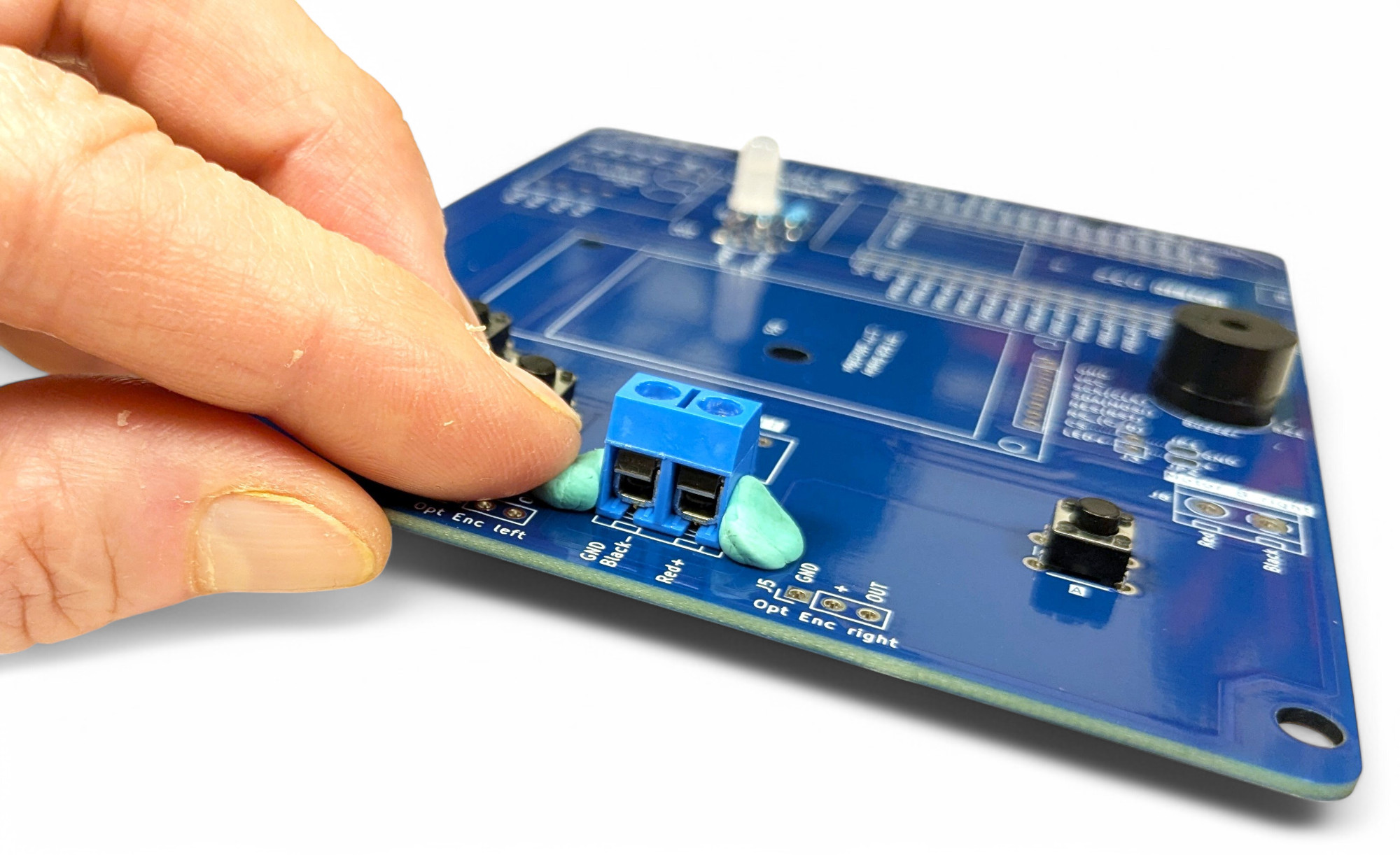 Verwende einen Tropfen Heißkleber oder kleine Kugeln klebende Knetmasse (Tac-It, Maniküre) damit sie nicht beim Umdrehen von der Platine fallen: