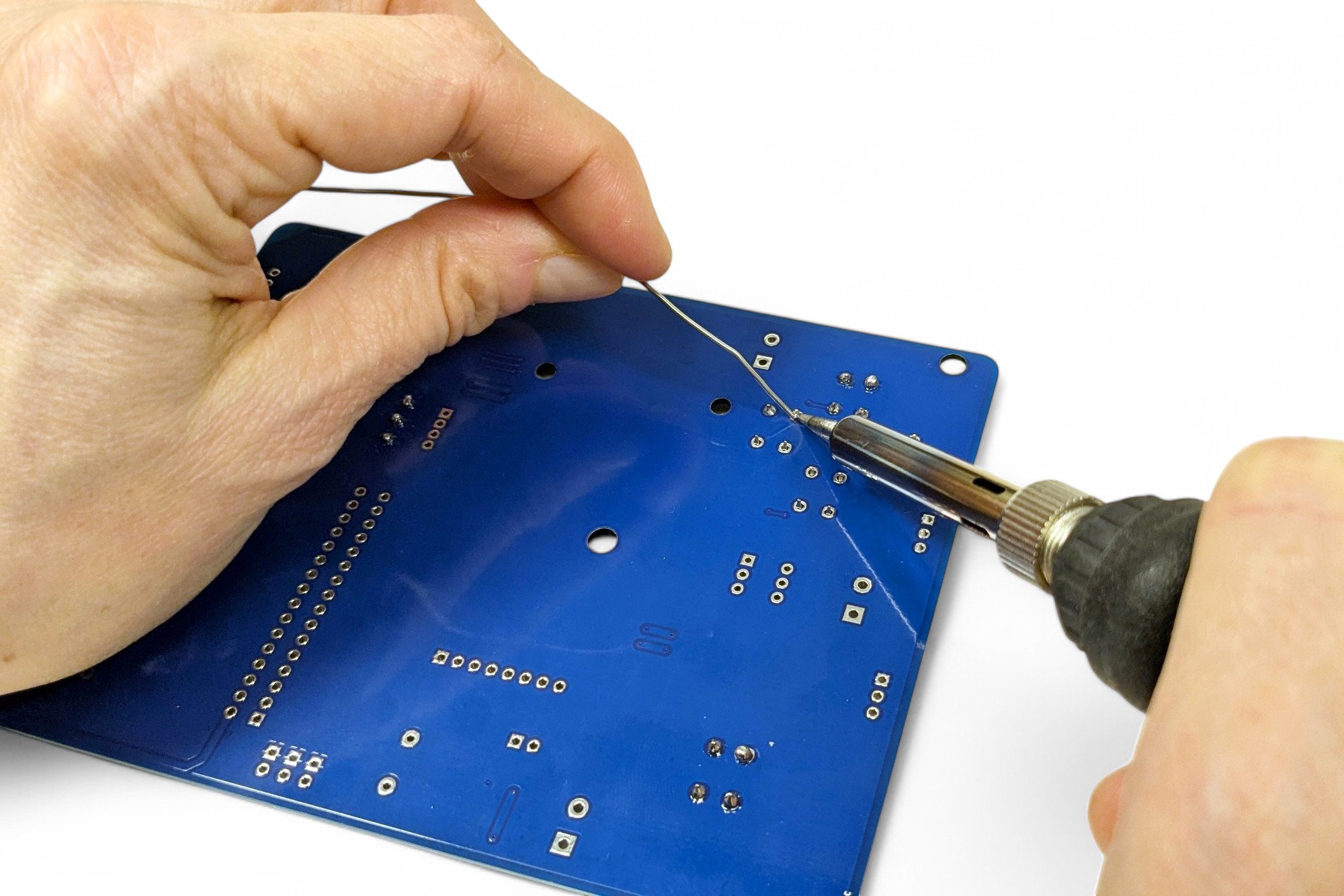 Als Rechtshänder nimmst du am besten den Lötkolben in die rechte Hand und das Lötzinn in die linke Hand. Lege die Hände am Tisch auf, sodass die Handballen den Tisch berühren. Dann zitterst du viel weniger. Lasse den Lötkolben nicht unnötig lange an der Lötstelle, sonst kann das Bauteil durch die Hitze beschädigt werden! Eine Sekunde reicht völlig.