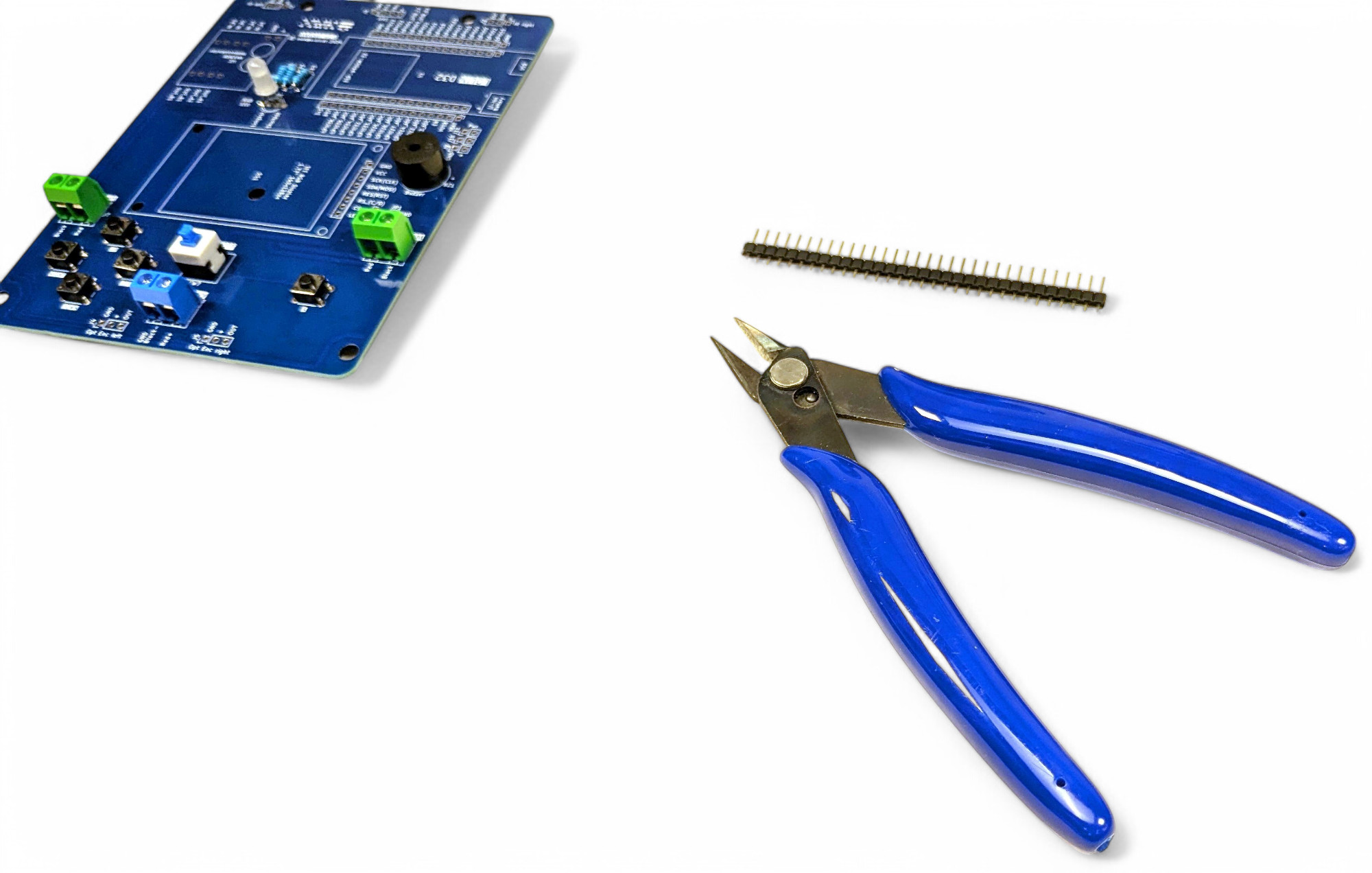 Für die Infrarot-Lichtsensoren benötigen wir zwei männliche Stiftleisten mit je drei Stiften. Nimm einen Seitenschneider und zwicke dei benötigte Länge von der langen Leiste ab.