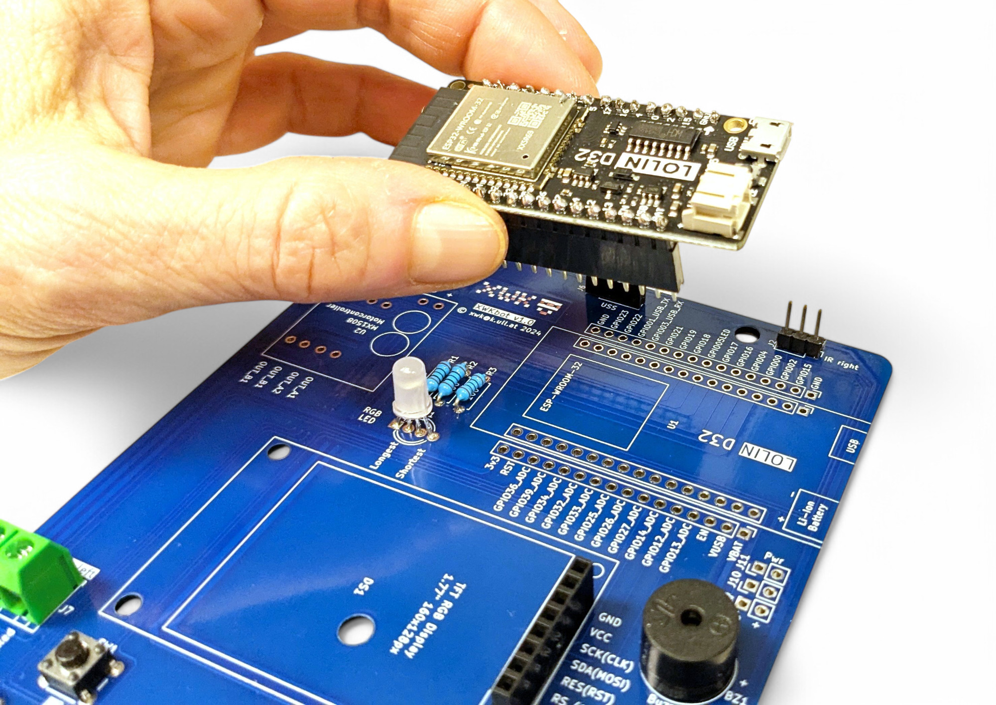 Die verbleibenden weiblichen, langen Buchsenleisten benötigen wir für den Anschluss des ESP-Microcontrollers “LOLIN D32”. Am besten du steckst die Buchsenleisten direkt am Microcontroller an, und dann in die Platine: