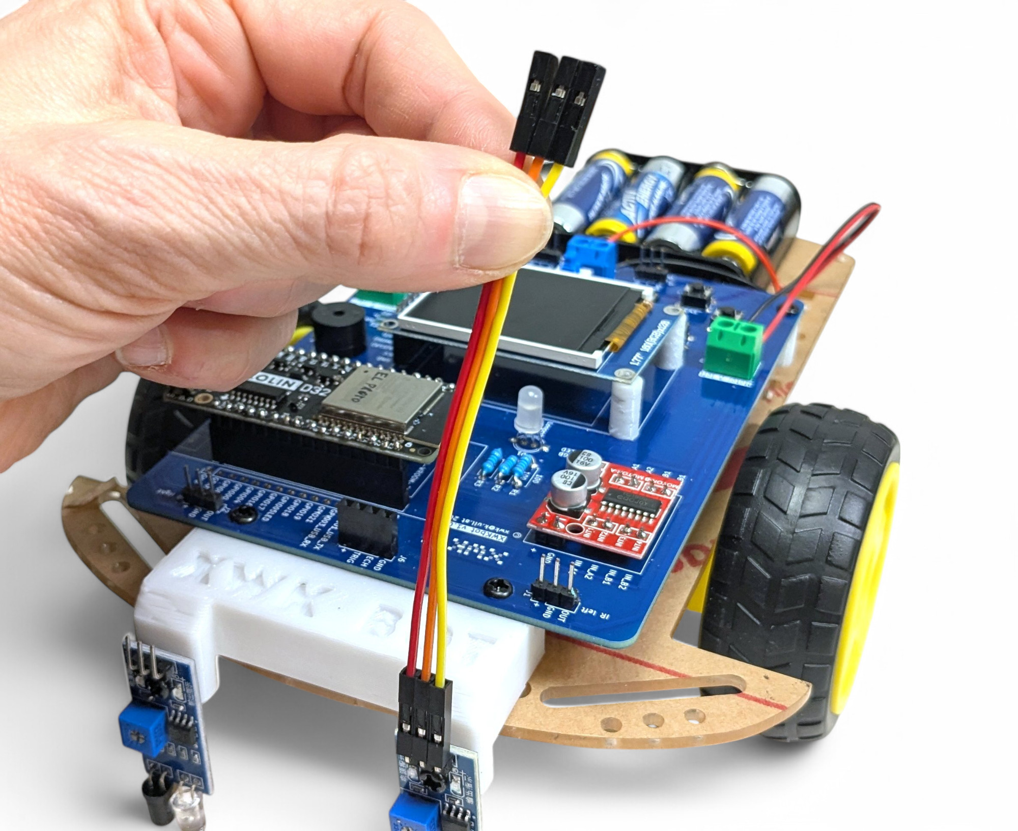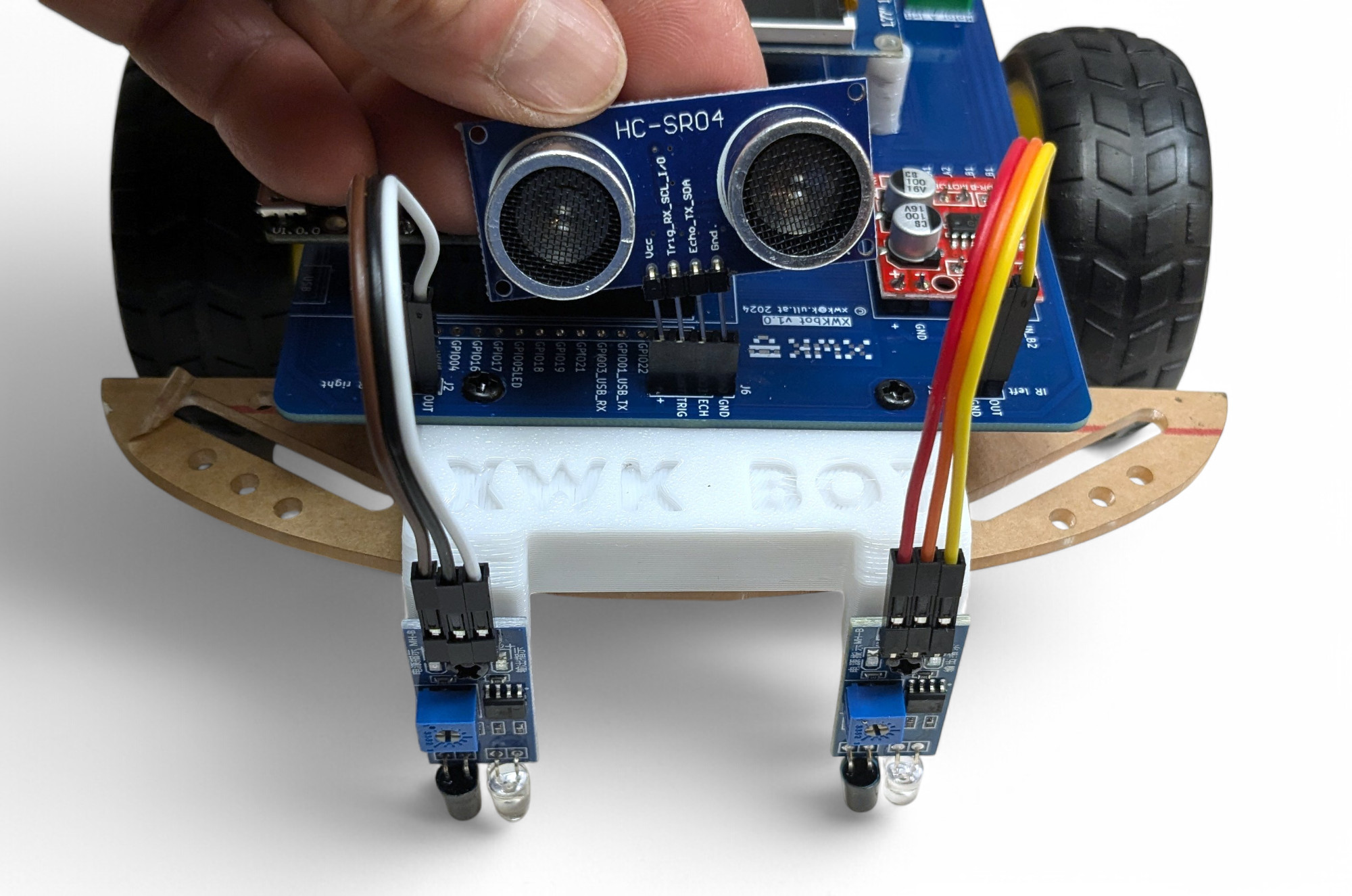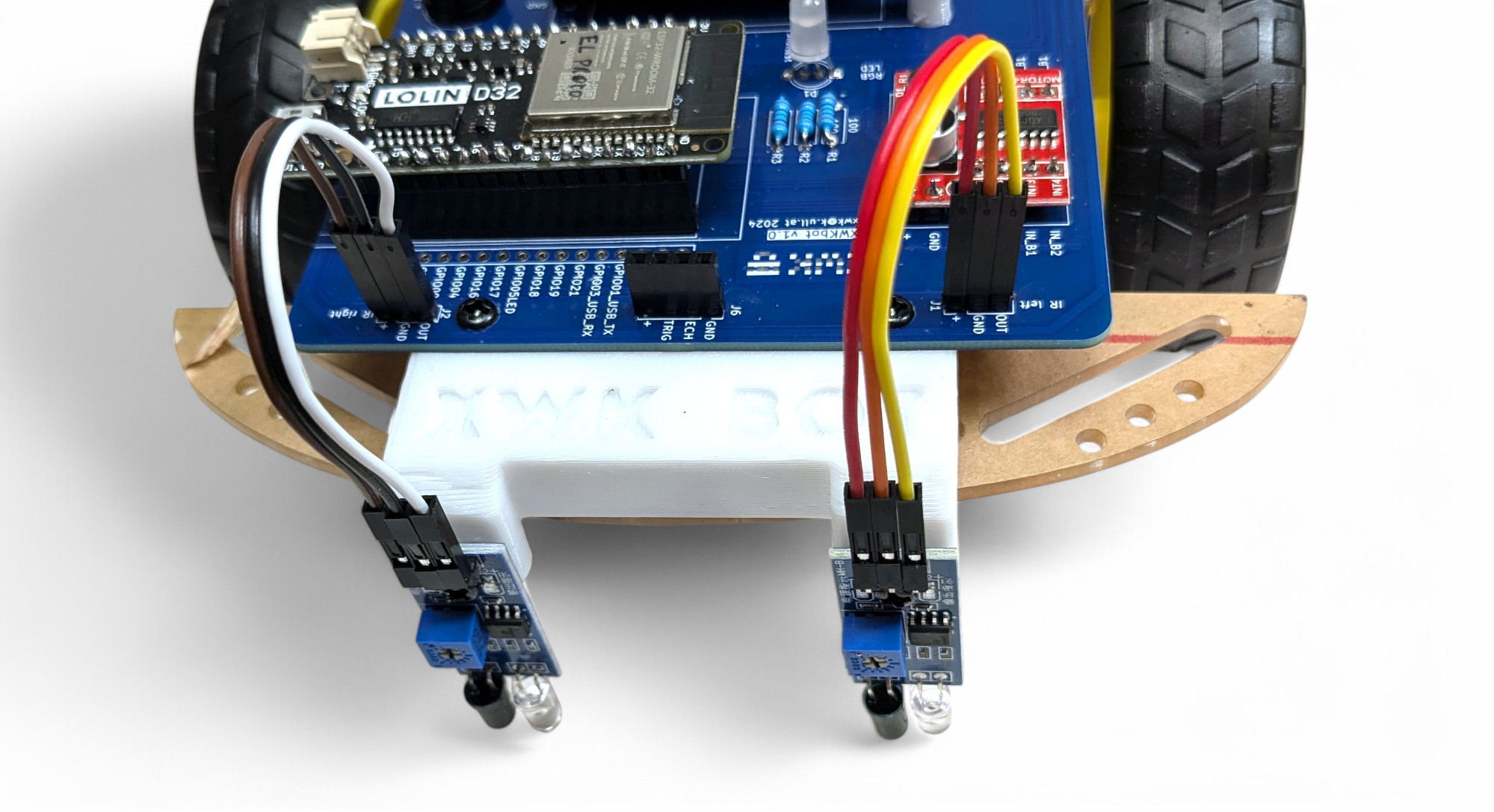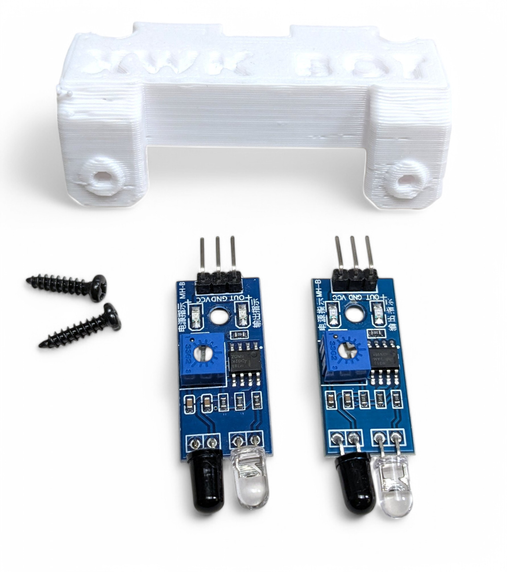 Schraube die beiden Infrarot-Sensoren auf die 3D-gedruckte Halterung: