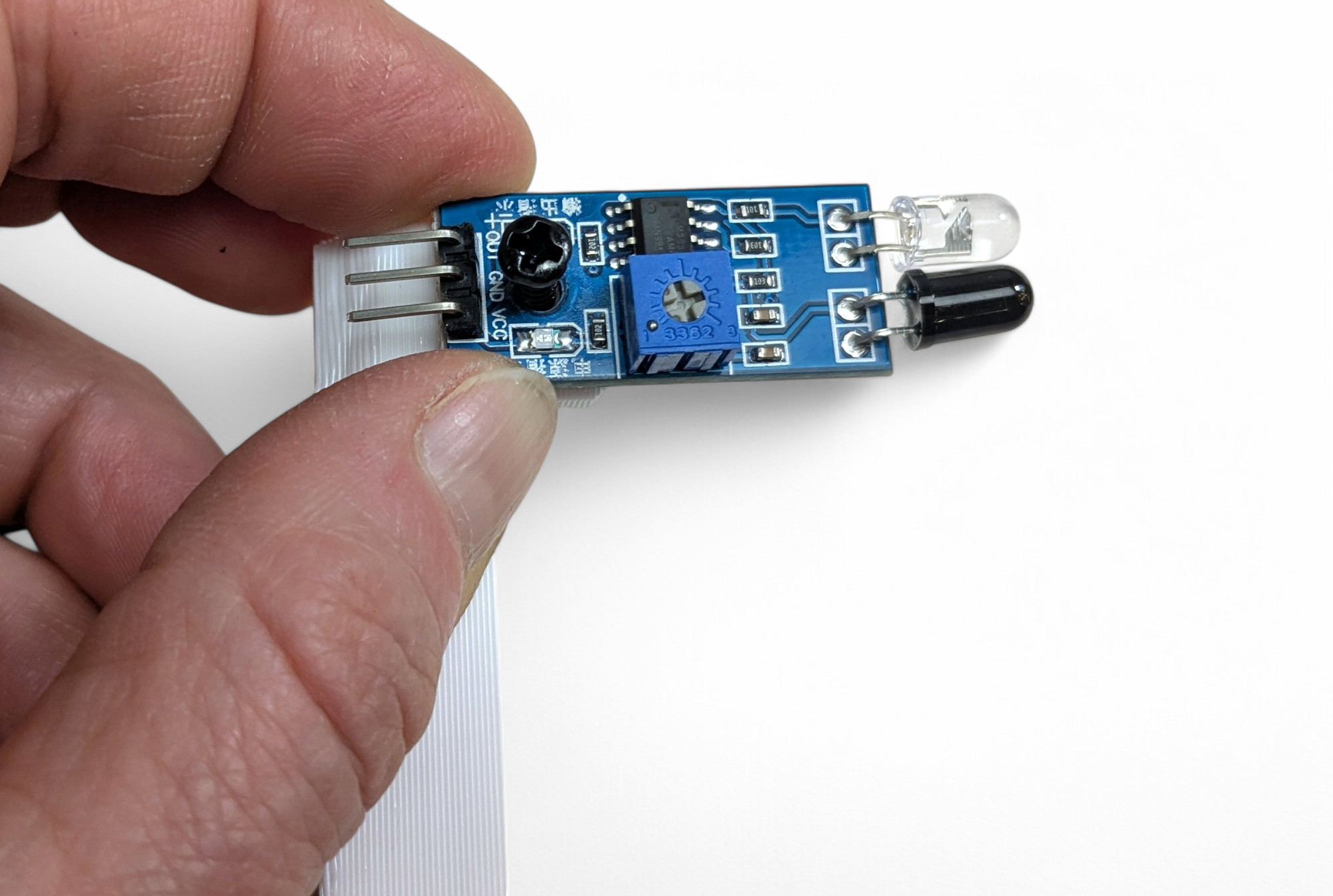 Ein Infrarot-Lichtsensor funktioniert wie ein Auge, dass nur hell und dunkel unterscheiden kann. Allerdings für Infrarot-Strahlung und nicht für sichtbares Licht. Dieses “Auge” ist die dunkle LED auf dem Sensor. Der Sensor hat auch eine “Taschenlampe” eingebaut die Infrarot-Licht ausstrahlt. Das ist die durchsichtige LED auf dem Sensor.