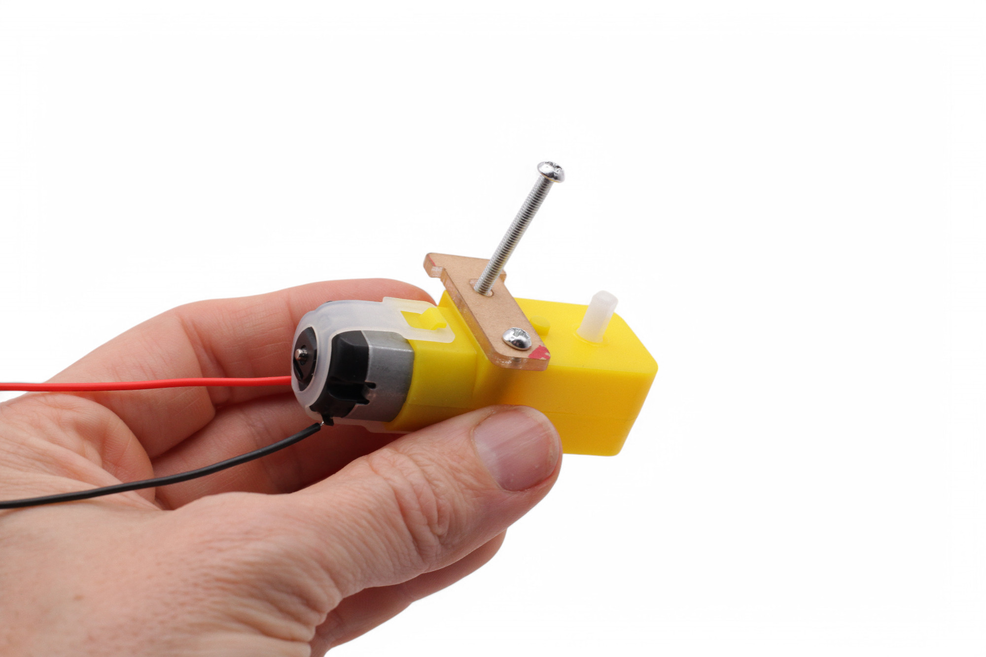 Nimm den Motor so in die Hand, dass die Anschlusskabeln von dir wegsehen. Dann stecke zwei lange M3 Schrauben durch das T-förmige Plättchen und den Motor: